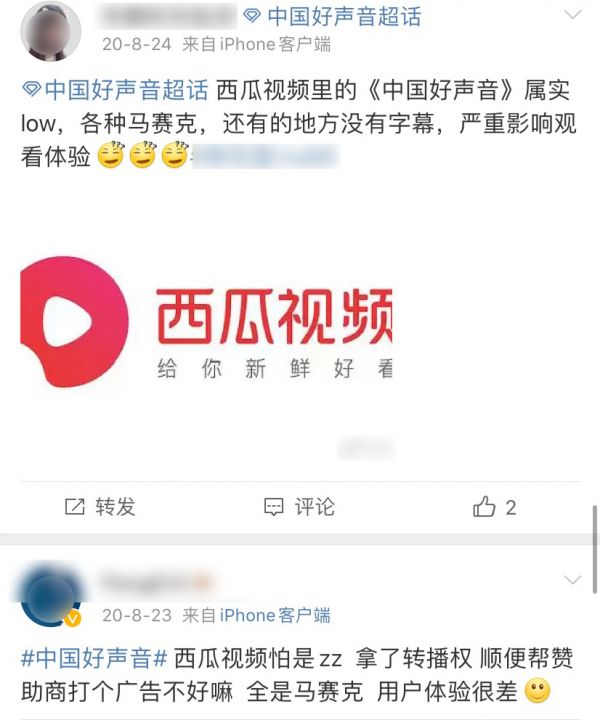 满屏马赛克,观众实在爱不起!节目缺乏新鲜感,平台没有好体验,《好声音》在西瓜视频越播越糊,最后没了声音。