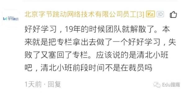 另一位实名为字节跳动的员工,在脉脉职场社区,“字节跳动好好学习(关闭)之后,下一个是谁”的相关回答下,则提到k12的清北网校小班业务。