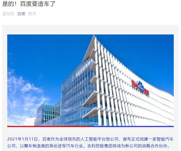 1月11日,百度宣布正式组建一家智能汽车公司,以整车制造商的身份进军汽车行业。吉利控股集团将成为新公司的战略合作伙伴。