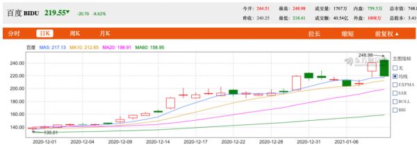 在百度正式官宣造车之前,市场传闻就已经帮助百度股价完成一次起飞。截至上周五,百度股价报240.25美元/股,公司股价在一个月内已经上涨67%。11日开盘后,百度股价最高涨幅达3.26%,报248.98美元。
