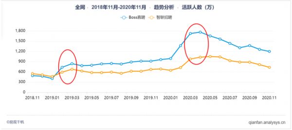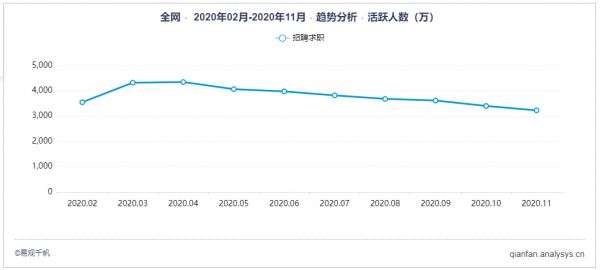 根据易观千帆数据显示,2020年求职招聘领域全年数据波动较大,金三银四依然是招聘高峰期,而金九银十招聘季效应不明显,整体用户规模依然呈下降趋势,增长动力稍显不足。2020年11月招聘求职行业用户在三千万左右,比起2020高峰期的三四月足足少了一千万月活。可见大家仍在蓄势待发,等待三四月的大量工作机会流出。