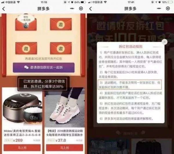 虚假红包、活动比较容易分辨,但一些违规拼团活动往往暗藏“玄机”,对于虚假、欺诈、抽奖性质、规则不清晰的拼团活动,比如拼团不成功转抽奖,拼团规则不清晰等行为,侵犯了消费者的知情权。