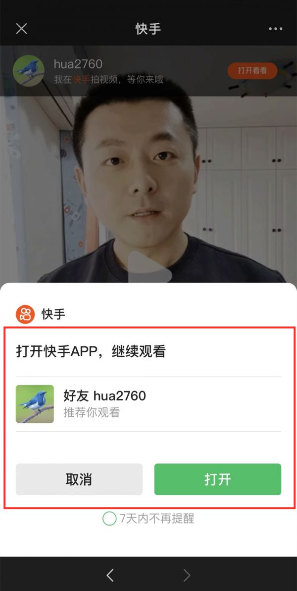 可以看到,在快手小程序中,打开页面自动弹出选项框,并且选项框UI违规模仿微信,让用户误以为是微信内部弹框,用户点击取消后仍会弹出离开微信的选框,狐假虎威,混淆用户试听的行为,在此次被严禁。