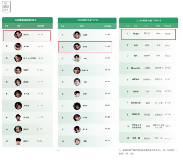 《2020腾讯娱乐白皮书》显示,无论口碑、热度、歌曲,周杰伦都名列前茅