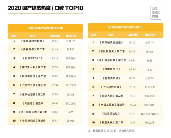 在2020年,影响力能跟社交短视频一较高下的,可能是网络综艺。《说唱听我的》制造了热点“魔动闪霸”,《说唱新世代》成为Z世代(95-00后)津津乐道的谈资,《明日之子:乐团季》和《乐队的夏天第二季》等乐队节目带动“乐队热”,《乘风破浪的姐姐》引发了关于“全开麦”的大讨论。
