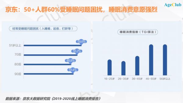 京东大数据研究院2020年3月发布的线上睡眠消费报告显示我国50岁以上的中老年人有近60%受睡眠问题困扰;49%的50+中老年人认为“出现睡眠问题要及时改善”;在各个年龄段中46岁以上中老年用户睡眠消费指数最高,睡眠消费意愿最强。
