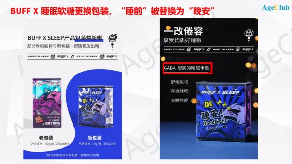 去年9月才上市的BUFF X 睡眠软糖在最近更换了新的包装,普通消费者可能觉得是为了更好的视觉效果。但新旧包装对比可以发现,旧包装上的“睡前”被替换成了“晚安”,其他和睡眠相关的宣称也消失不见。