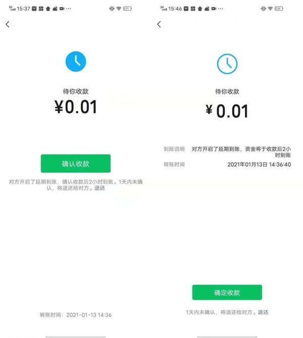 原先的收款图标设计发生了改变,白色的图标设计变得更简洁了;原先在「确认收款」下方的说明和转账时间一起被放在了收款页面中间;「确认收款」的按钮则从页面中间变到了底部。