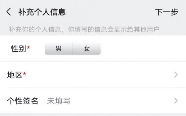 先是新用户点击进入「附近的直播和人」时,需要补充包括性别、地区在内的个人信息,填写的信息会展示给其他用户。只有完成了这一步,新用户才能点击「下一步」进入「附近的直播和人」。