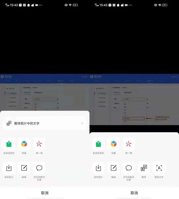 打开一张有文字的图片,长按唤出操作页面,你就会发现操作界面新增了「翻译」和「提取文字」两个功能。