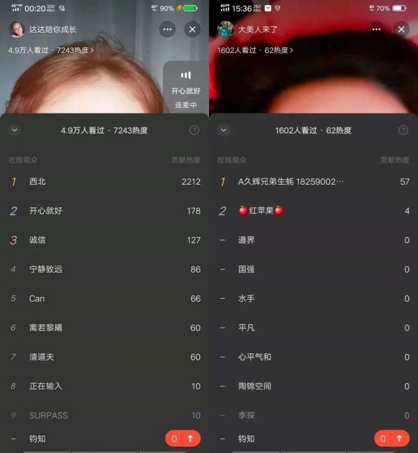 部分用户在这个页面还能看到一个热度贡献榜。点进任意直播,就能看到该直播间的热度贡献情况。这个设置看上去很像传统直播平台的打赏排行榜。
