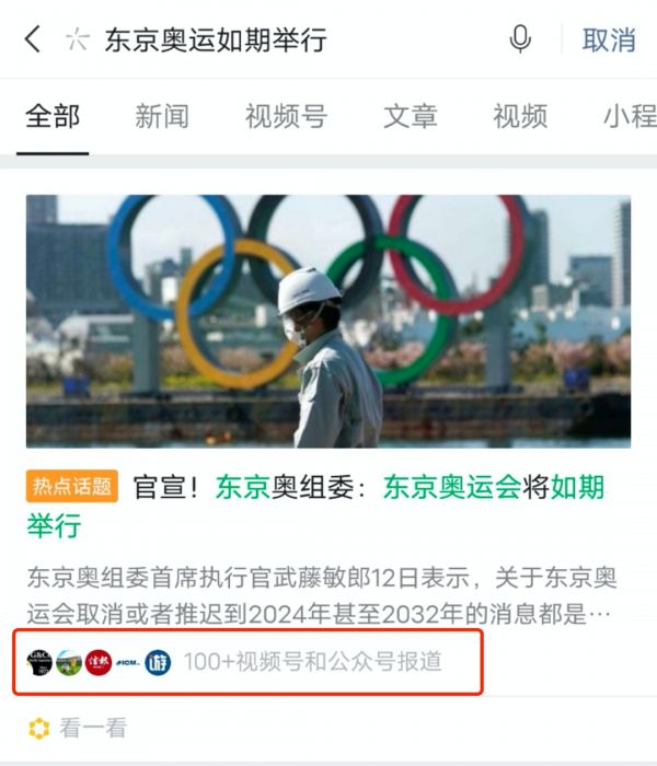 而在搜一搜中,用户点击任意话题即可进入搜一搜页面,页面会提示用户该话题已有「8 家视频号和公众号报道」。