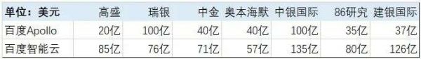 主流投行对百度新业务的估值(截止2020年底)