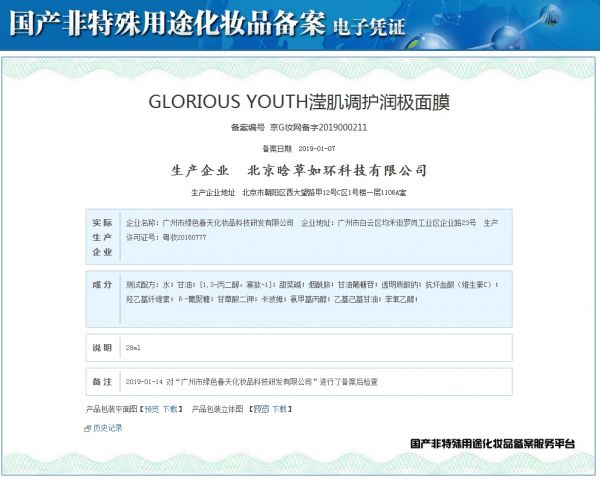 中新经纬客户端在其产品备案信息中发现,该面膜的生产厂家是一家名为广州市绿色春天化妆品科技研发(下称“绿色春天”)的公司。