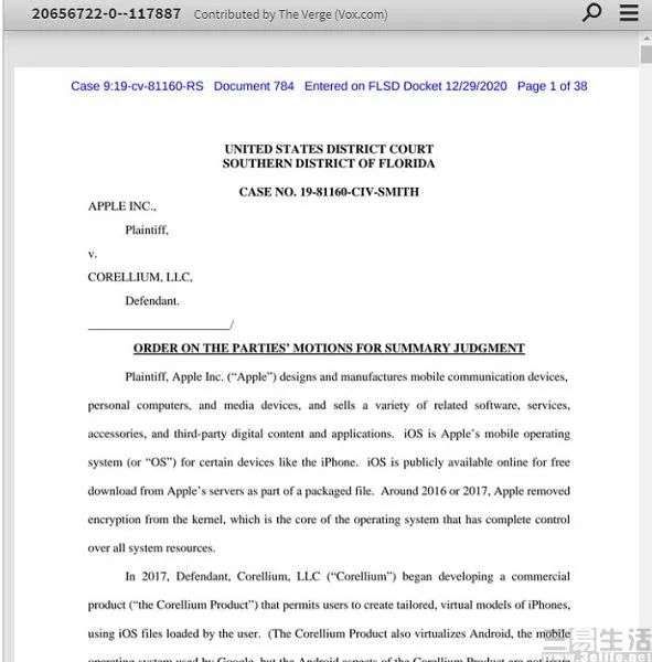 通常在类似的版权纠纷中,苹果方面都会轻松取胜,但这次事情却发生了一点变化。在经过了一年的庭审后, 美国佛罗里达州联邦法官Rodney Smith驳回了苹果对于Corellium侵犯其版权的指控,并认为Corellium使用苹果的代码构成了合理使用。
