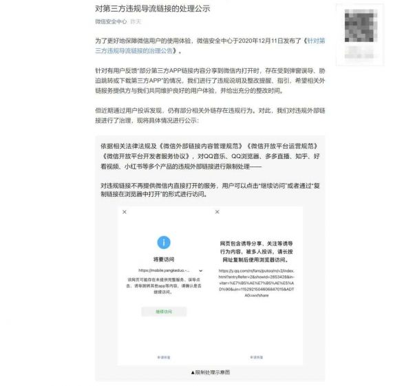 微信也绝非是“突然发难”,早在一个月之前,微信安全中心于2020年12月11日发布了《针对第三方违规导流链接的治理公告》,其中提到了对第三方App链接做出规范的出发点。微信一直致力于为用户提供更加便捷、顺畅的操作体验,也希望为各类合作伙伴的合规服务进行护航。
