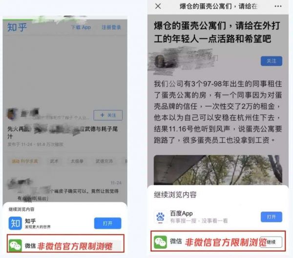 第三种是“不能在页面上查看完整内容”,涉及QQ浏览器、好看、知乎三个App,它们的网页都会在点击播放按钮或点击“展开阅读全文”按钮时,弹出离开微信选项框。