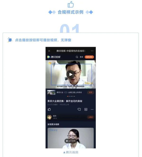 微信安全中心也给出了两个合规样式示例:第一个是腾讯视频,用户在页面中点击播放按钮即可观看视频,没有弹窗出现;第二个是凤凰新闻,正文展开有文字提醒,不易让用户误解而且点击没有弹窗。