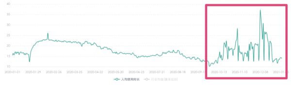 红框为Keep融资前后的人均使用时长数据来源:极光大数据