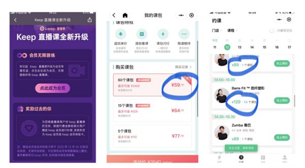 Keep以前跟supermonkey一样定价79元档的线下课程,今年涨到了89和129;涨价之后再用折扣做平衡,但今年的折扣力度比往年大,以前双11最便宜是64一个课包,现在变成59了。