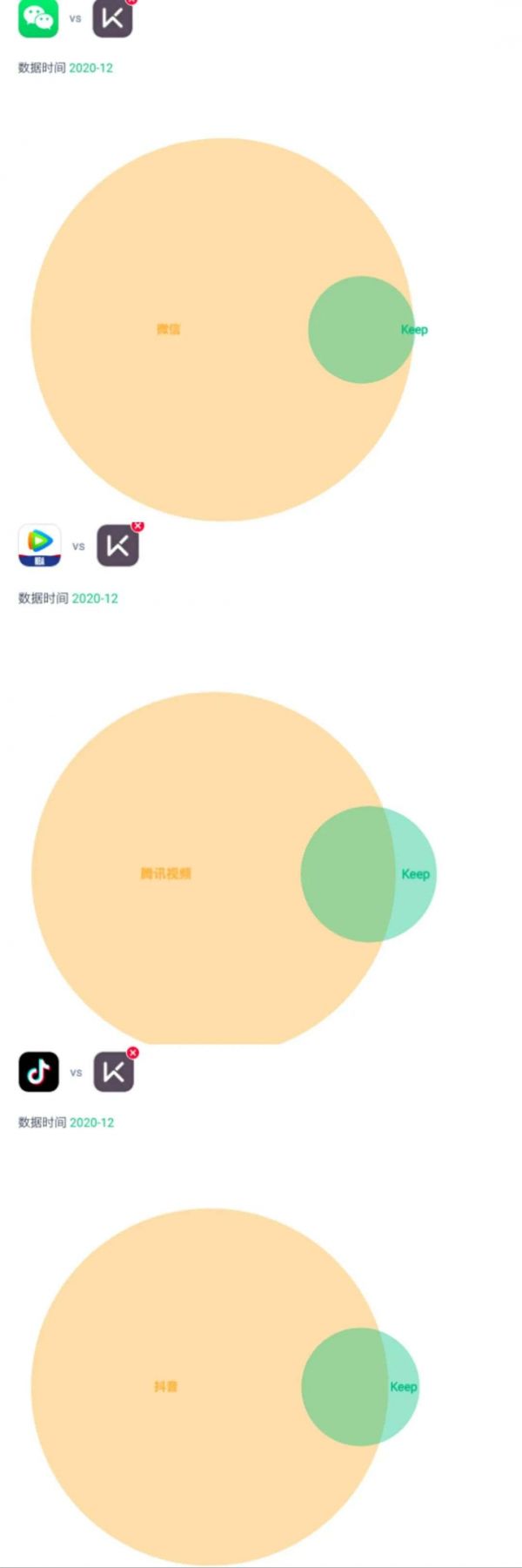 仅选取微信、抖音和腾讯视频作为示例,可视化对比流媒体和Keep用户的重合情况,垂直类产品对标国民应用,怎么看都是被淹没其中。