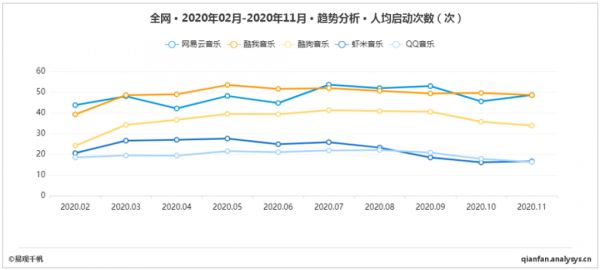 另外,数据也证明了2020年虾米的人均启动次数是在一路下跌的。用户们可能大多是看着虾米一点点长大的,支撑着他们手机里依然留着虾米的可能是情怀,但也只有情怀了,毕竟任谁对着一列灰掉的歌曲列表都没有再次打开的欲望吧。