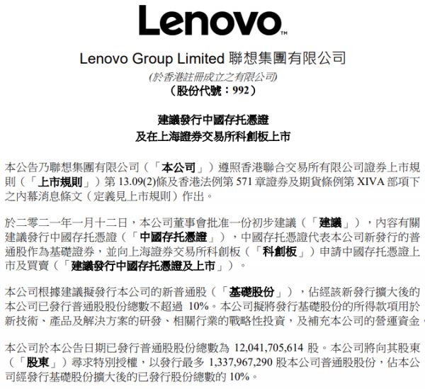 1月12日晚9时左右,联想集团披露公告,宣布董事会已批准可能发行中国存托凭证(CDR)并向上海证券交易所科创板申请CDR上市及买卖的初步建议。
