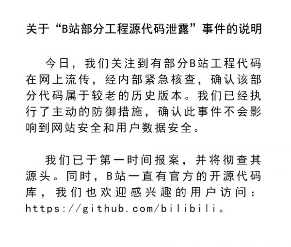 B站对“部分工程源代码泄露”事件作出说明。