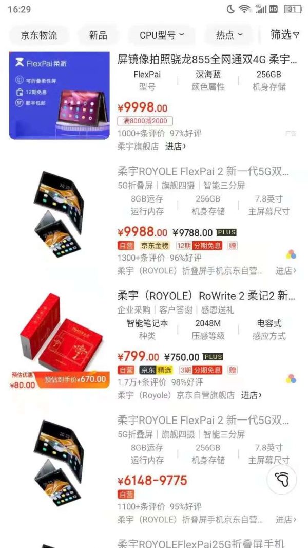 在6家距离较近的深圳顺电店铺实际走访过程中,我们都看到了FlexPai 2真机陈列,店员表示现货也很充足,基本每天都有销量。1月7日在平安店没有看到展出样机,店员表示可以在深圳其他门店体验到真机,本店“就这几天”就会到货。12日再到店里,发现FlexPai 2已有真机上架。从官网查询到的广州太古汇店,因顺电店面装修暂时无法体验,而广州海珠区江南中营业厅里也看到了FlexPai 2真机,但暂时没有现货,店员称如果需要购买可以电话预定。从以上实地探访的情况来看,柔宇在线下实体店的铺货速度还是可圈可点的。