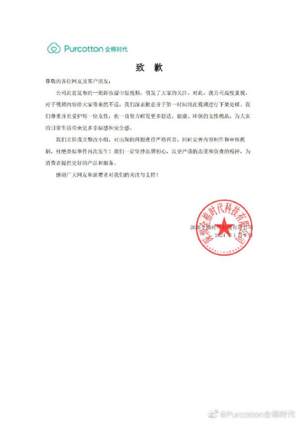1月8日,全棉时代两次回应该事件,首次回应,是在官方微博评论区公开回复评论:“视频为广告创意,仅作突出商品的清洁功能,抱歉带来不适,目前已将视频下架。”
