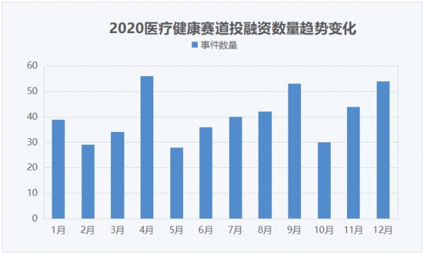 从全年投融资交易数量变化趋势来看,2020年医疗健康赛道并没有明显的“寒”“暖”季之分,基本维持在每月40起交易事件左右。