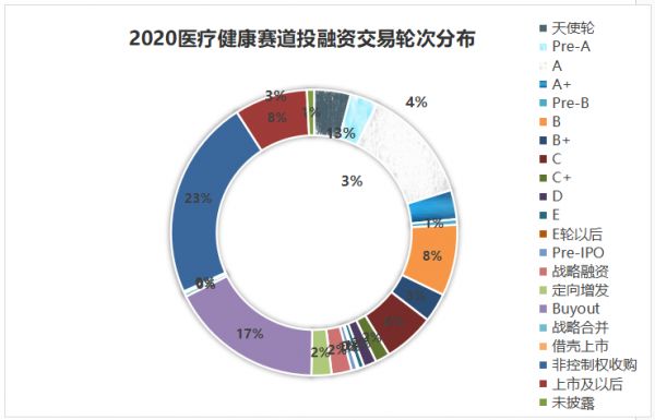 从CVSource投中数据来看,医疗健康赛道2020年共发生110起非控制权收购事件,是全年投融资数量占比最大的一部分,buyout(控制权收购)交易紧跟其后,全年共84起,占比达到17%。
