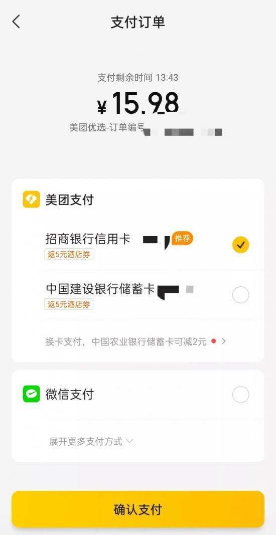另外,在1月12号,也就是事情发酵的后一天,不管是美团外卖还是美团优选,月付还是被放置在支付方式的最前端,而支付宝被折叠。并且部分情况下有时会显示使用月付支付会有额外优惠的情况,但是在点击开通月付并支付选项时都会有明确的指示要求用户先阅读并同意《美团月付授信付款合同》。