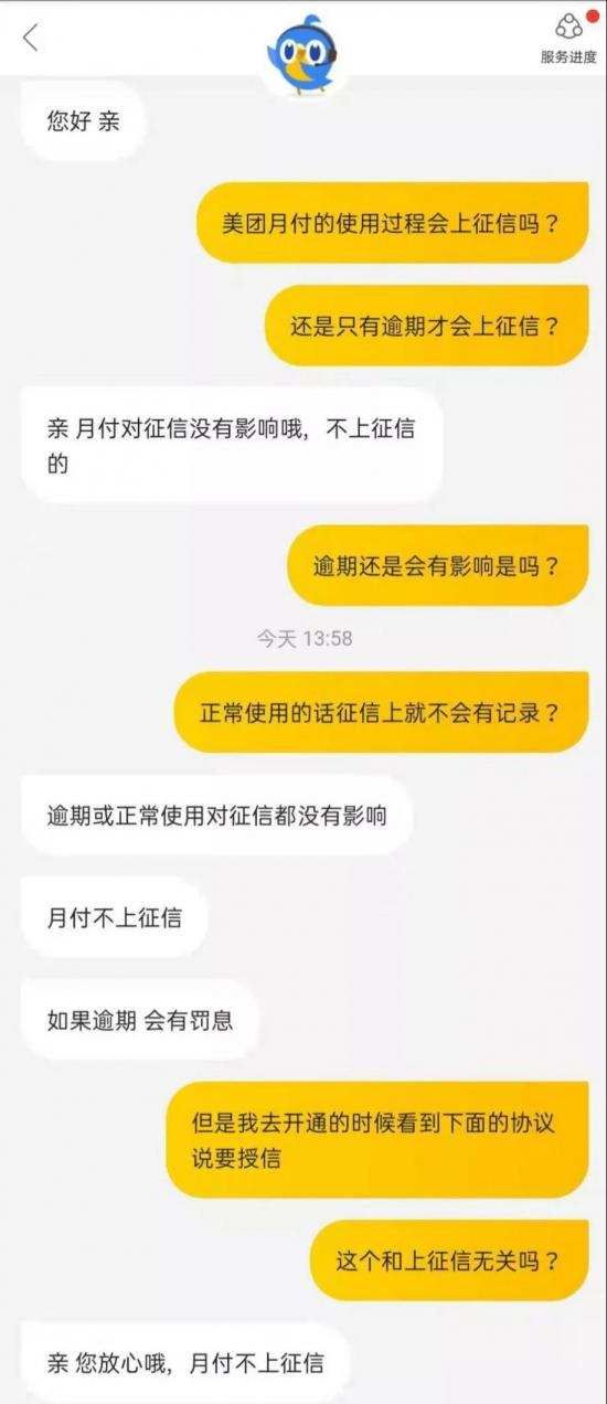 如下图所示,在与客服的对话中可以确定,虽然开通美团月付时个人的综合信用情况会被调查,但是月付不论是使用还是逾期都不会影响个人征信情况,不过逾期后还是会有0.05%的罚息。
