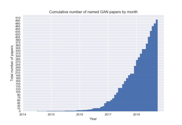 有人还专门为它建立了一个GAN Zoo,用来收集所有已被命名的GAN,目前已经有500多个了。欣赏一下这令人咋舌的增长曲线: