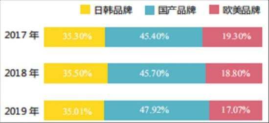 “国进外退”的趋势下,2019年国产品牌的市场份额已经增长至47.92%,欧美品牌下降明显,但占据35.01%份额的日韩品牌仍是有力竞争对手。