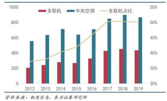 根据《机电信息》和东兴证券的数据,单元机市场中格力、美的和海尔三大白囊括了约80%的份额;多联机市场中2019年美的、格力以10%以上的份额紧追大金,海尔与三菱重工海尔的份额加起来也逼近了10%。