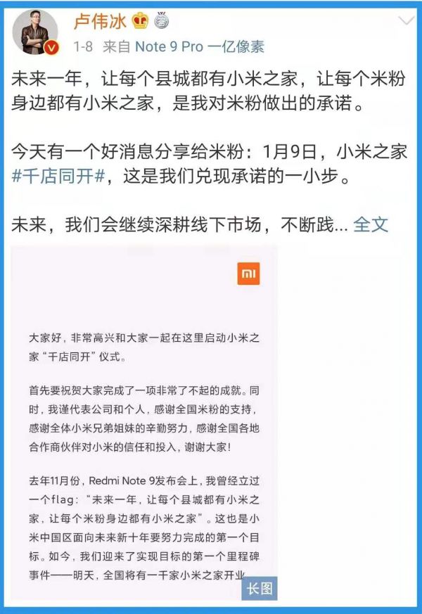 1月8日,卢伟冰通过公开信表示,千店同开正是兑现承诺的一小步。