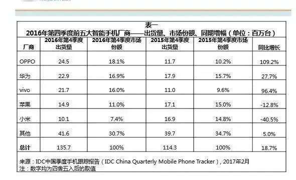 那一年,华为、OV成为中国智能手机市场全年出货量前三,其中OPPO的增长率高达122%,首次成为年度冠军。