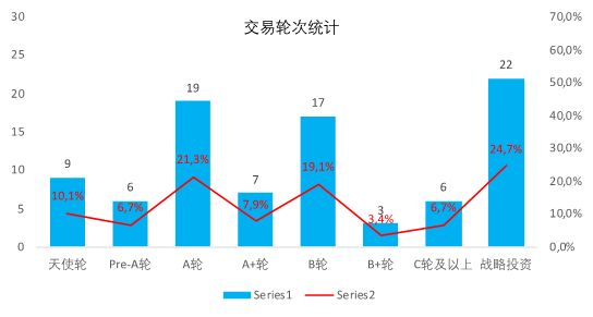 从交易轮次观察,早期投融资时间共34起,占比38.2%;战略投资占比24,7%。