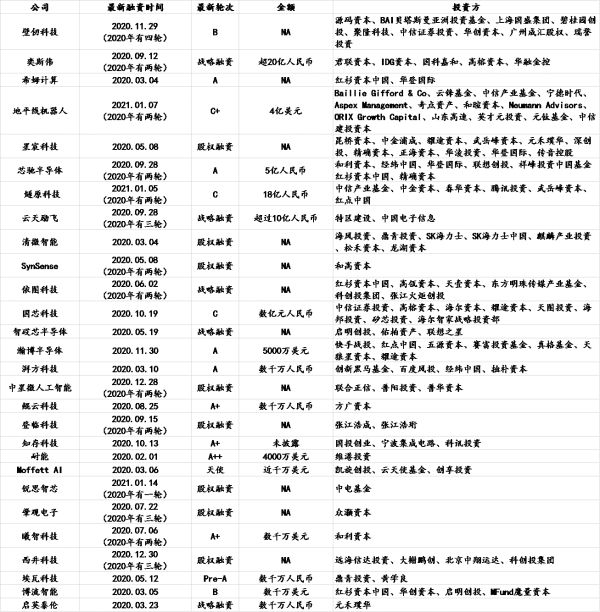 2020年人工智能行业整体融资趋缓,但AI芯片领域有多家公司一年内获得多轮投资,其中不乏高额单笔融资。