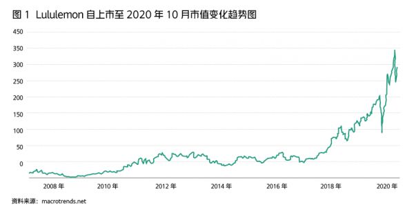 受新冠肺炎疫情影响,包括运动服饰在内的体育运动行业遭到重创,而Lululemon的市值经历短暂下滑后继续一路上扬(图1),稳坐全球第二大运动品牌的位置(编者注,截至2021年1月15日,Lululemon市值为431亿美元,耐克为2218亿美元,阿迪达斯为338亿美元)。