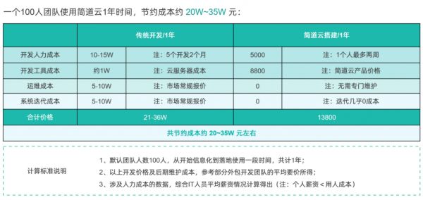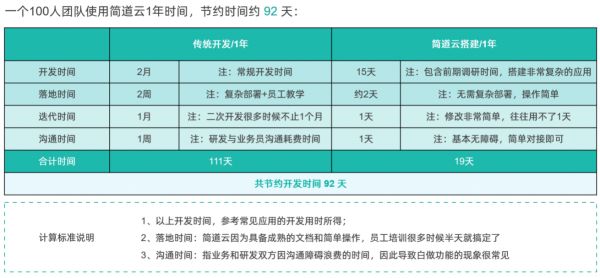 而且,低代码开发的确能解决客户的实际需求,帮助他们降本增效,客户能切身感受到这一点。我们结合客户拜访信息和市场数据做过测算,一家100人的企业,如果用传统方式开发,保守估计也要30万左右的经济成本,投入时间110天以上。但如果使用低代码工具简道云,一年各种成本加起来一两万就够,节省十几倍;投入时间不超过20天,缩短五倍。