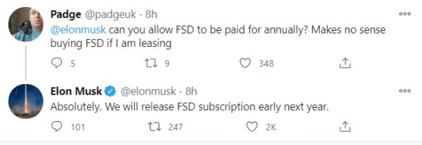 马斯克宣布 2021 年将推出自动驾驶订阅服务|Twitter
