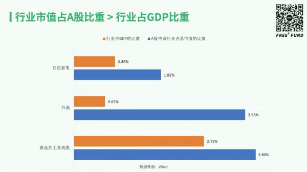 行业市值占A股比重 > 行业占GDP比重的行业,包括白酒、食品加工及肉类、白色家电等。