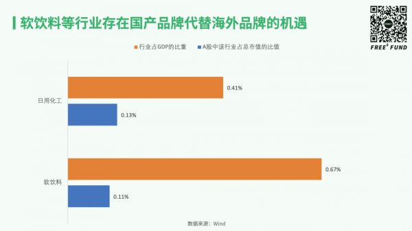 第一,在软饮料、日用化工等细分赛道,海外品牌在中国有可观的市场,但是外国公司不能在 A 股上市,这类行业存在国产品牌代替海外品牌的机会。
