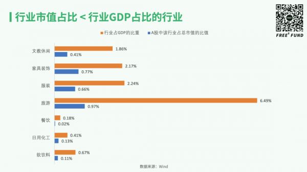 软饮料、服装、旅游、餐饮、日化等上图列出的这些行业,都颇具产业规模,在GDP中占据一定比例。然而,从数据来看,目前这些行业在资本市场的市值可能还没有充分反映其实际规模。