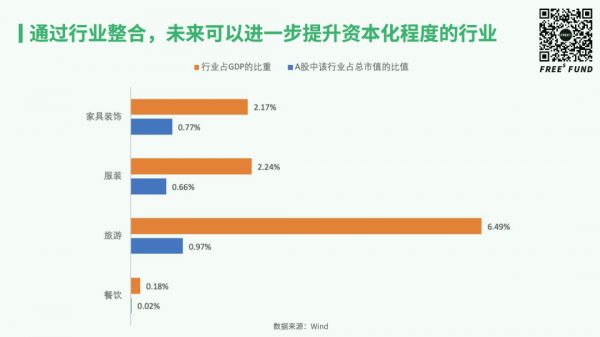 旅游、餐饮、家具家装及服装作为GDP的重要构成部分,共计占GDP比重达到11%左右,由于主要产品标准化程度低,市场较为零散,所以这些行业的资本化率也比较低,这几个行业整体在A股中市值占比合计仅有2.42%。未来,随着旅游、餐饮及家具家装行业生产标准化程度以及市场集中程度提升,资本化程度或将大幅提升。