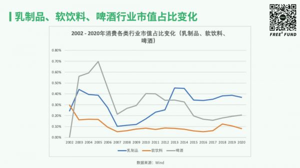 2008年,因为三聚氰胺事件,乳制品行业在供给端进行结构性改革,产品品质提升,生鲜奶价格上涨,乳制品行业的盈利性空间变大。从2011年开始,乳制品行业占A股市值比例开始大幅提升,一直持续到2013年,达到峰值后趋于稳定。