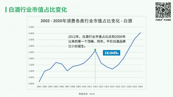 2012年到2013年,白酒的市值占A股比重大幅增长。2012年,白酒行业市值占A股比重达到2000年以来的第一个顶峰,同年,平价白酒品牌江小白诞生。在白酒市值回调的阶段中,江小白的市场份额进一步扩大,逐渐被消费者熟知。一个原因可能是,白酒业的龙头公司将精力集中在高中端白酒,忽略了平价白酒的市场需求。
